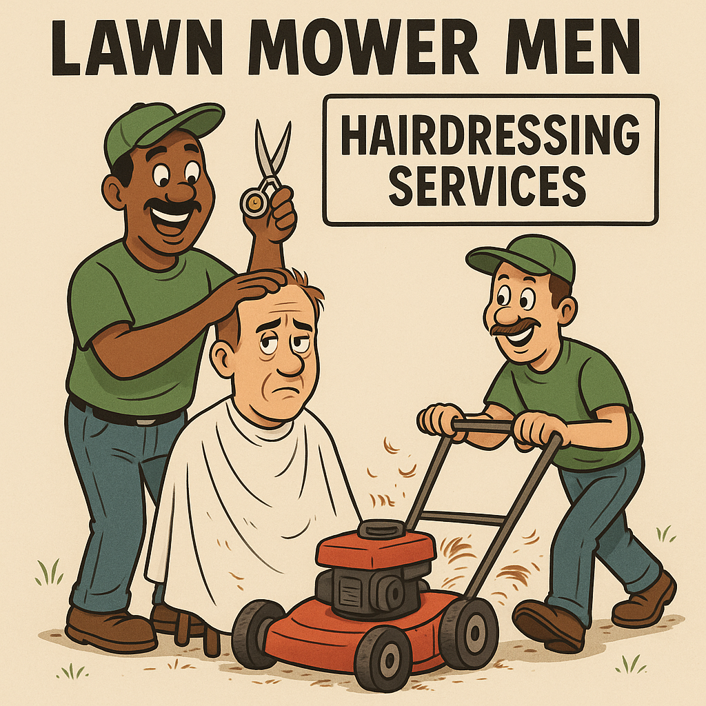 Beneath it stood two grinning lawn-mower men: Daryl and Baz, proudly polishing their mowers like they were precision salon tools.